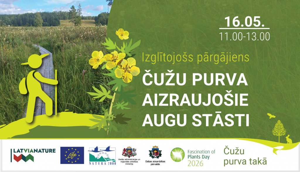 Dabas liegumā “Čužu purvs” notiks izzinošs pārgājiens kopā ar LatViaNature dabas eksperti Lindu Uzuli. Dalībniekiem būs iespēja iepazīt dažādas ekosistēmas — zālājus, mežus, purvus – Abavas upes apkārtnē un dzirdēt aizraujošus stāstus par tur sastopamajiem augiem.