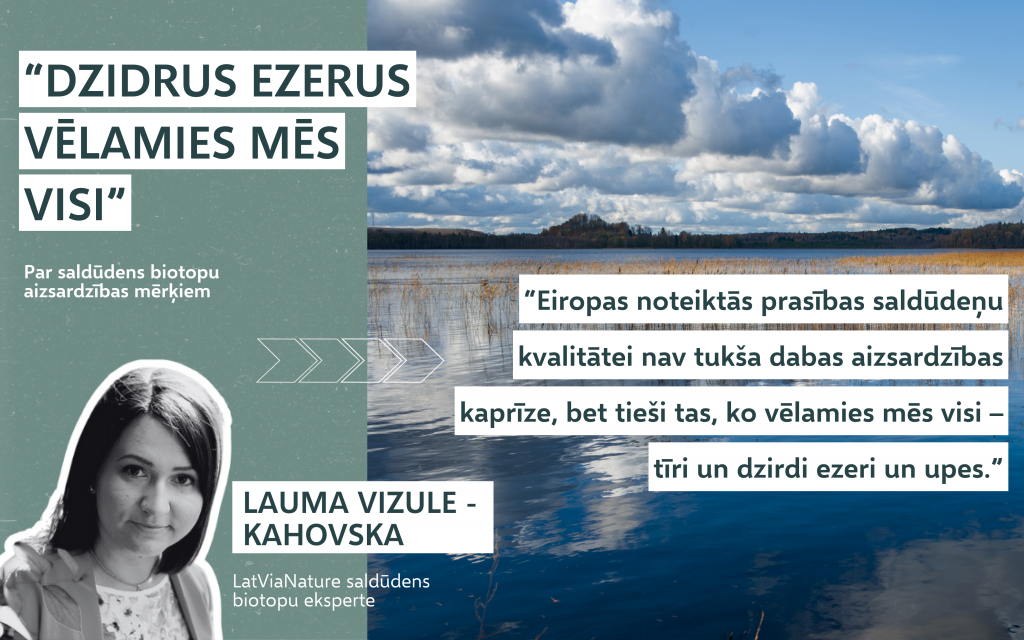 “Eiropas noteiktās prasības saldūdeņu kvalitātei nav tukša dabas aizsardzības kaprīze, bet tieši tas, ko vēlamies mēs visi – tīri un dzidri ezeri un upes! “ pārliecināta Dabas aizsardzības pārvaldes projekta LIFE-IP LatViaNature saldūdeņu biotopu eksperte Lauma Vizule – Kahovska. Šis projekts, kura laikā tika noteikti arī saldūdeņu biotopu jeb dzīvotņu skaitliskie dabas aizsardzības mērķi, parādīja, ka saldūdeņu kvalitāte Latvijā lēnām pasliktinās, tāpēc to aizsardzība ir īpaši svarīga. Aizsargājamo teritoriju tīklā būtu jāiekļauj arī vairāki jauni ezeri, kuros atrodami lieli dabas retumi.